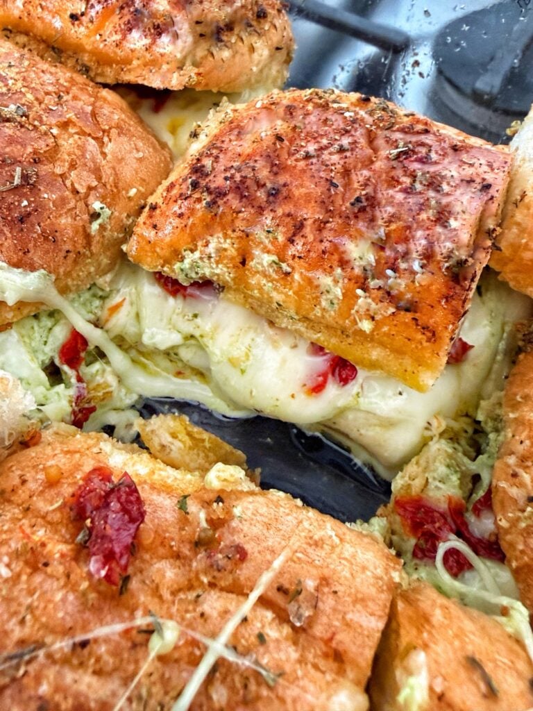 A Meat Free, Cheesy Treat If you’re looking for an easy baked slider recipe, these pizza pesto grilled cheese sliders are for you. These are made with soft French rolls, creamy pesto cream cheese, melty mozzarella, and oil-packed sun-dried tomatoes. This gives a bold Italian-inspired flavor. Brushed with a garlic butter made from the sun-dried tomato oil and baked until golden. This cheesy pull-apart appetizer is perfect for game day, parties, or a quick weeknight dinner. My Recipe Origin Story I was raised Catholic and went to Catholic school, so Lent always meant no meat on Fridays. It felt like…