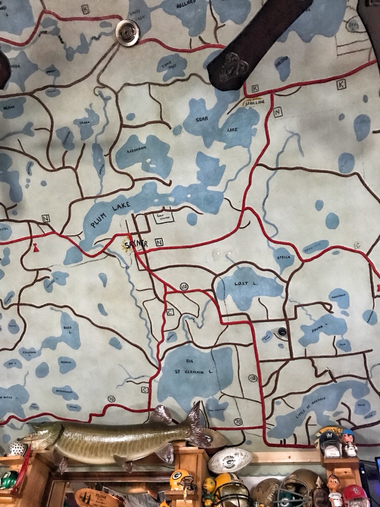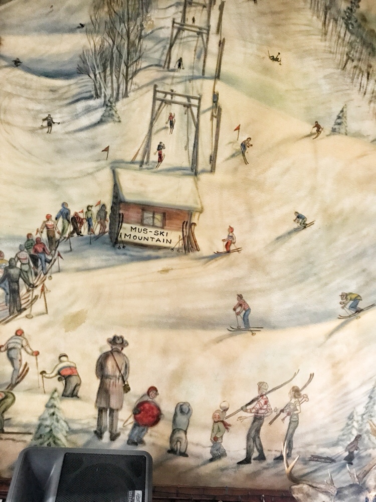The ceiling in the bar area was hand-painted by the bartender’s grandfather when they first opened. One half of the ceiling is a map of all the lakes and the other half is a beautiful, wintery ski scene.