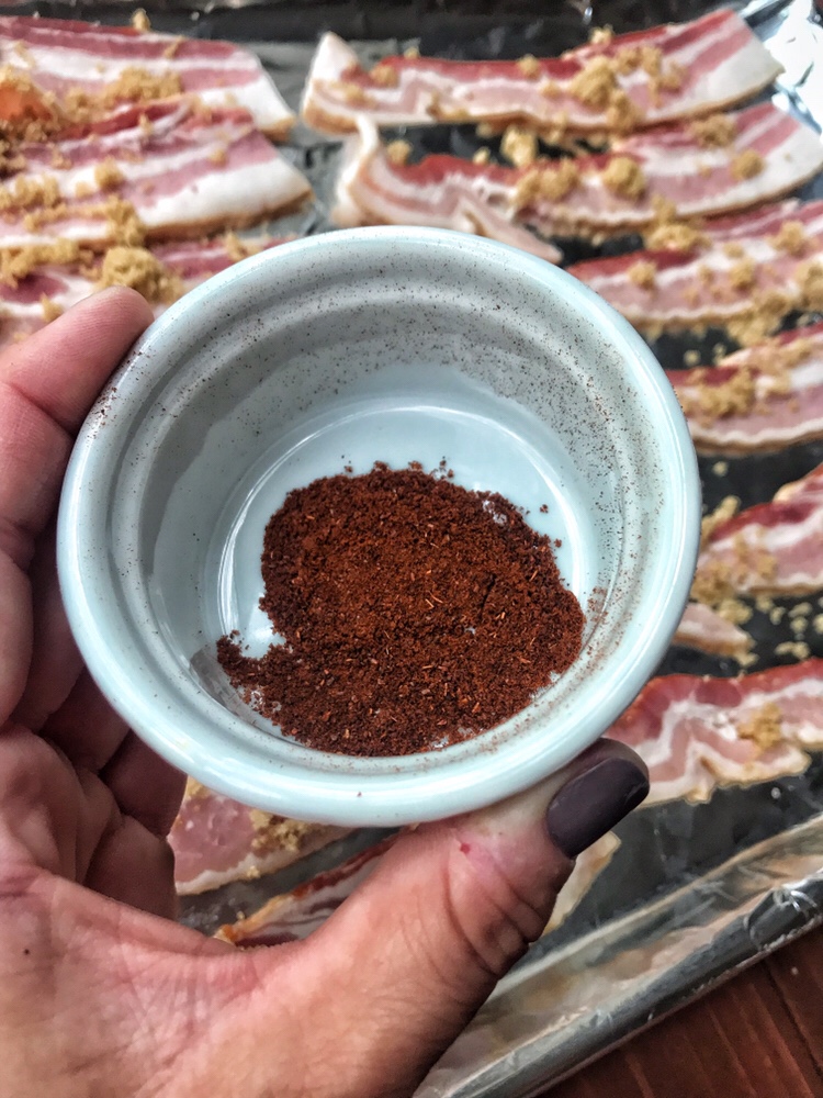 The bacon making step will also require a foil covered cookie sheet, brown sugar, chili powder, and freshly ground black pepper.