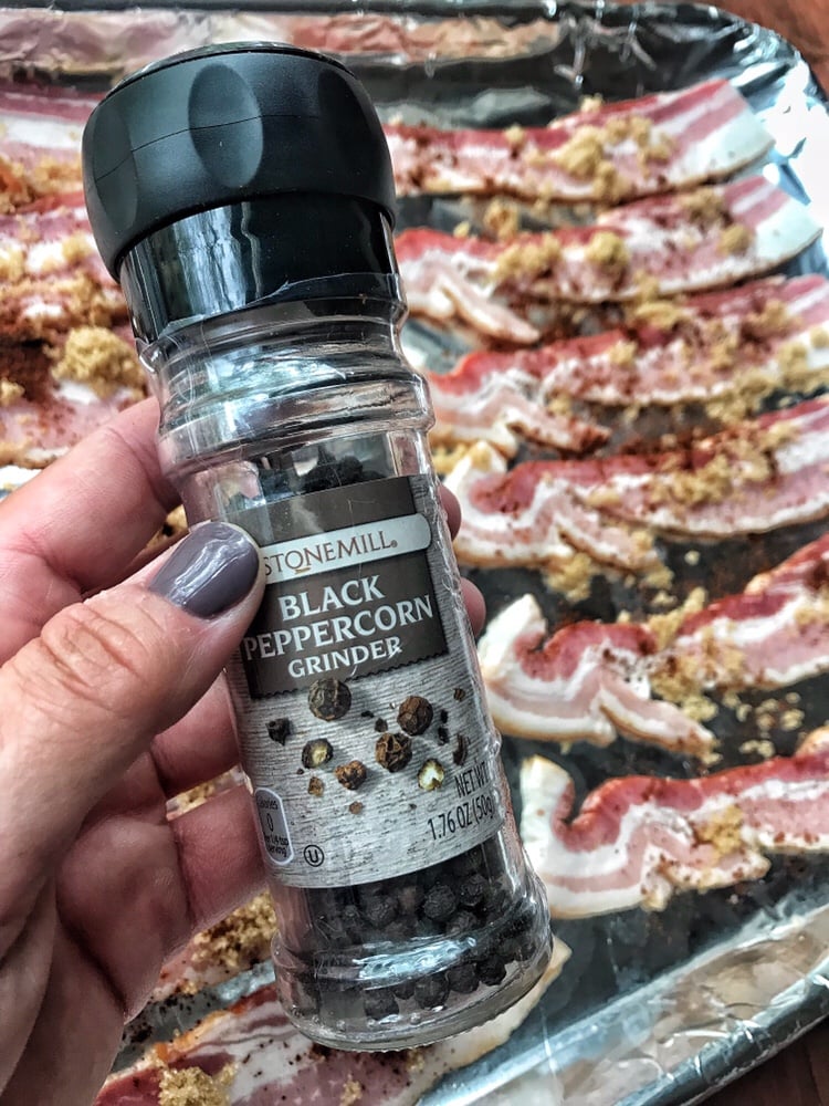 - Next, sprinkle the chili powder, brown sugar, and cracked black pepper evenly across all the slices of bacon.