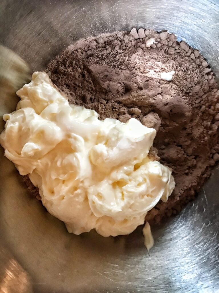 You can find the full, printable recipe card at the end of this post but it’s actually pretty simple. All it takes is a box of Devil’s Food Cake Mix, cold water, eggs, and the secret ingredient: mayonnaise.