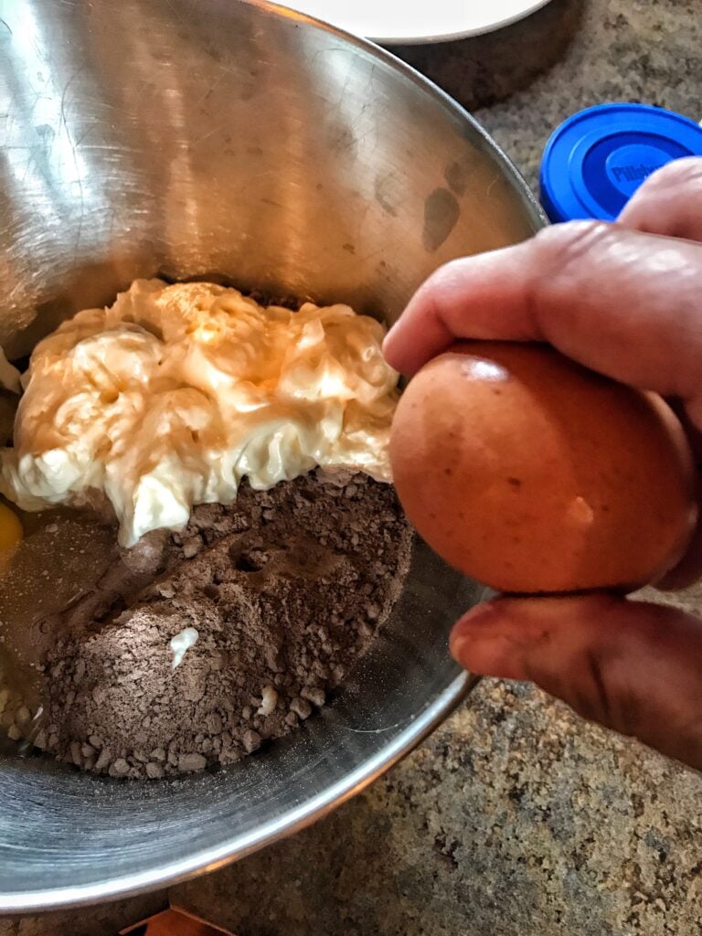 As previously mentioned the full recipe card is at the end, but all you have to do is pour the cake mix in the bowl, add the cup of mayo and cold iced water followed by three, room temperature eggs.