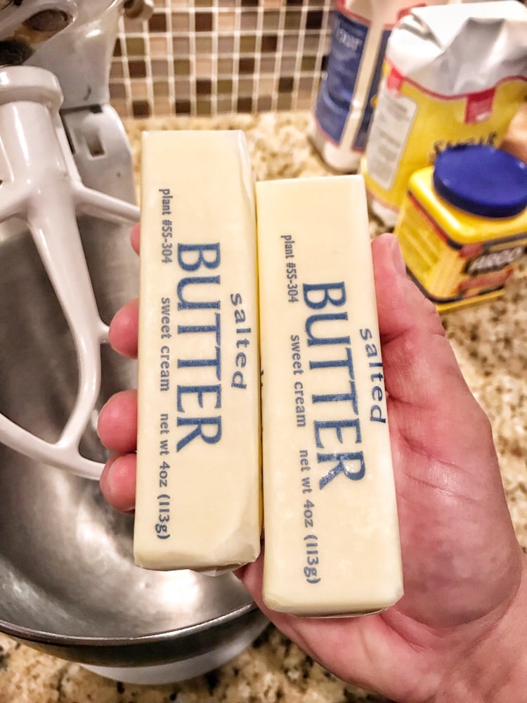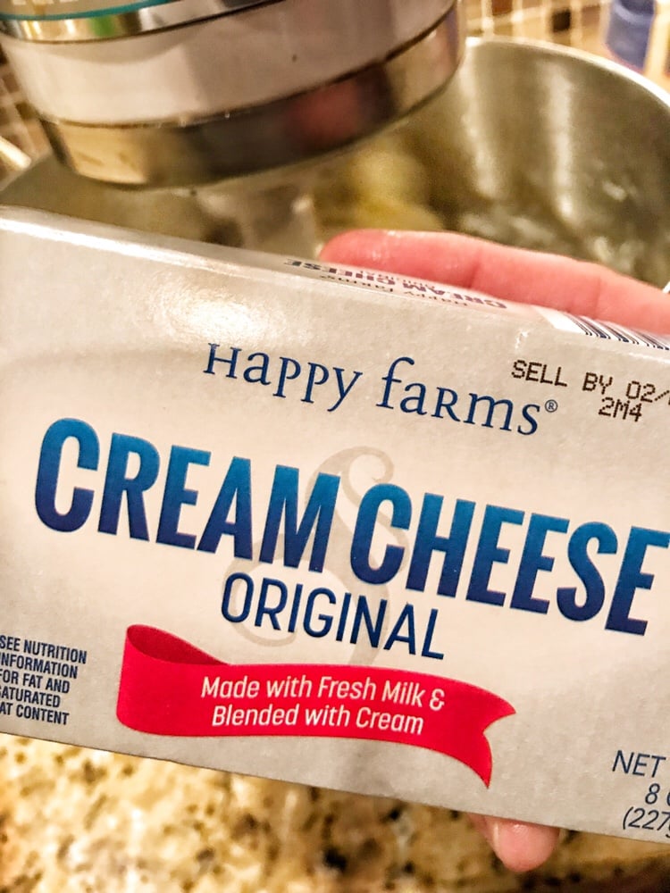 You’ll want to be sure to remove your butter, eggs, and cream cheese from the fridge a little in advance so they can soften, warm up, and soften respectively.