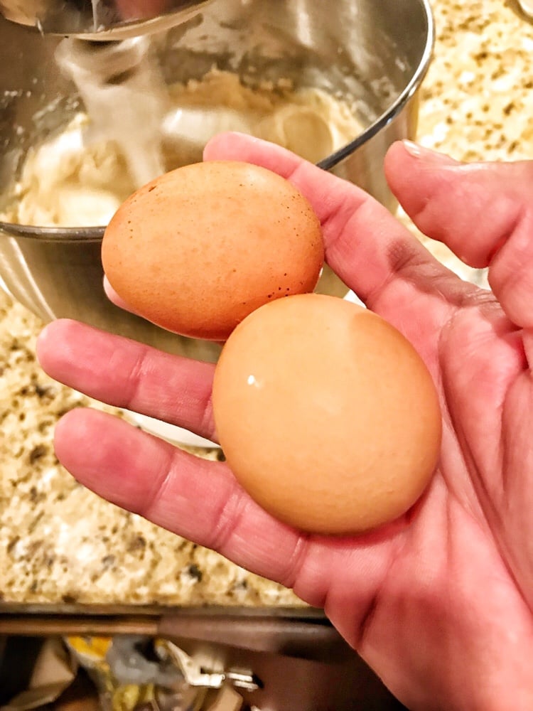 - Add the eggs one at a time and combine each egg into the mixture before adding the second.