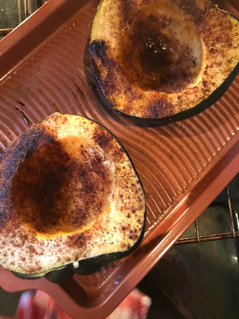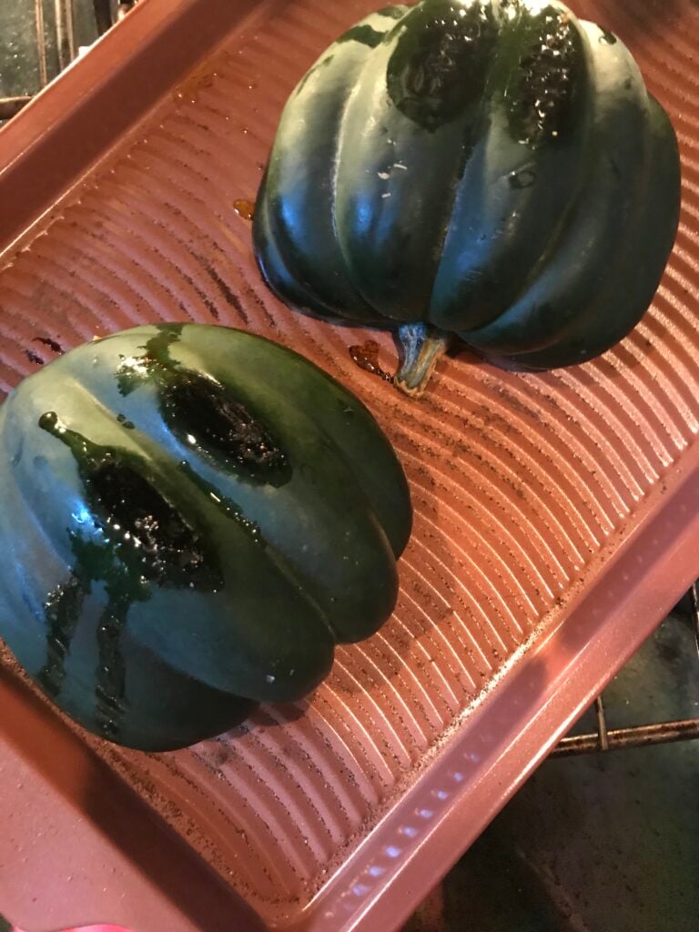 All you have to do to make an acorn squash is slice it in half, clean out the seeds, add a little oil and seasoning, and bake it for about 30 minutes at 350 degrees.