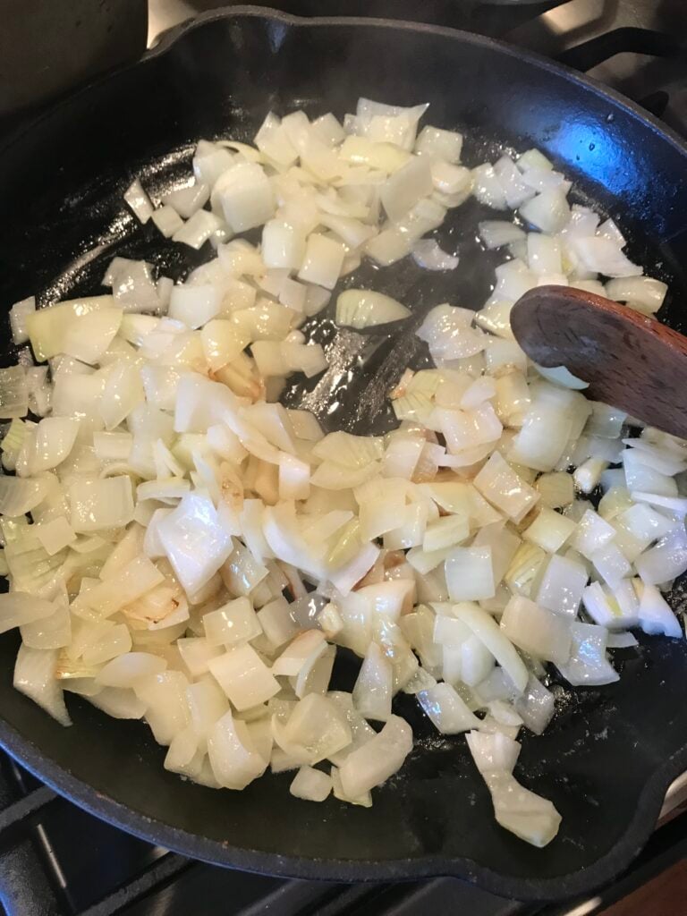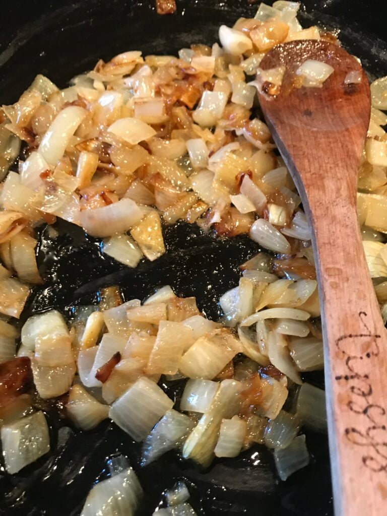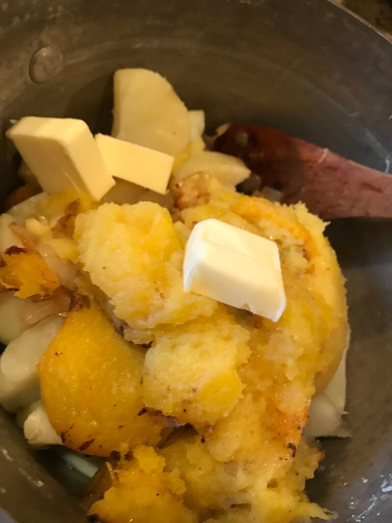 - While the squash bakes, add half the stick of butter to a skillet with the onion and sauté on low flame until the onions turn a rich brown color. Add the brown sugar and allow it to keep cooking until the squash is done.