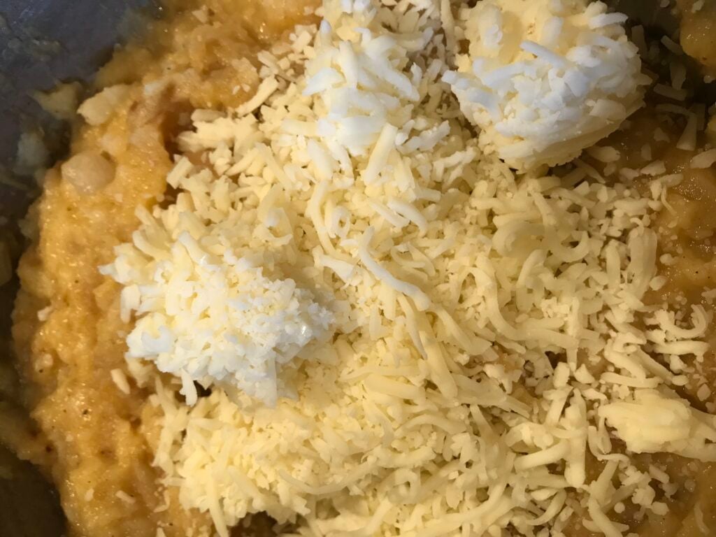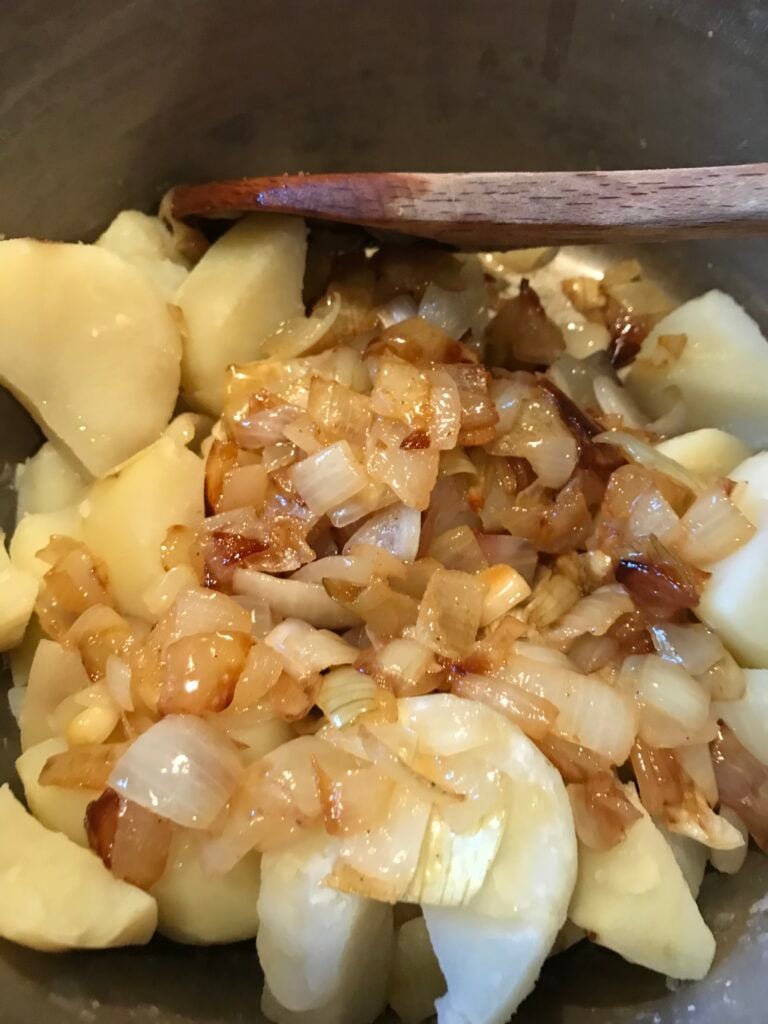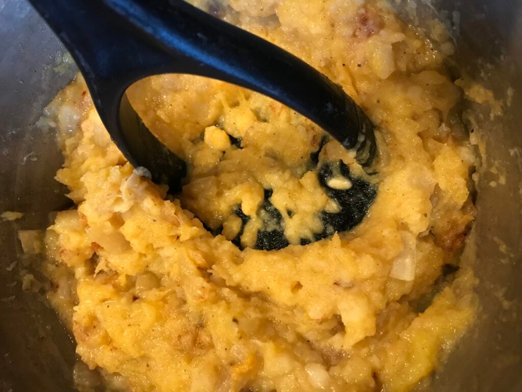 - In the bowl with the squash, add the onions, the prepared mashed potatoes, the milk, the eggs, butter, and the cheese. Stir well until it is combined.