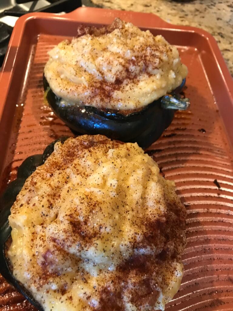 I had been thinking of adding a vegetarian recipe to my Holiday collection of recipes and that is when I decided to make a Cheesy Stuffed Acorn Squash with Whipped Potatoes and Caramelized Onions.