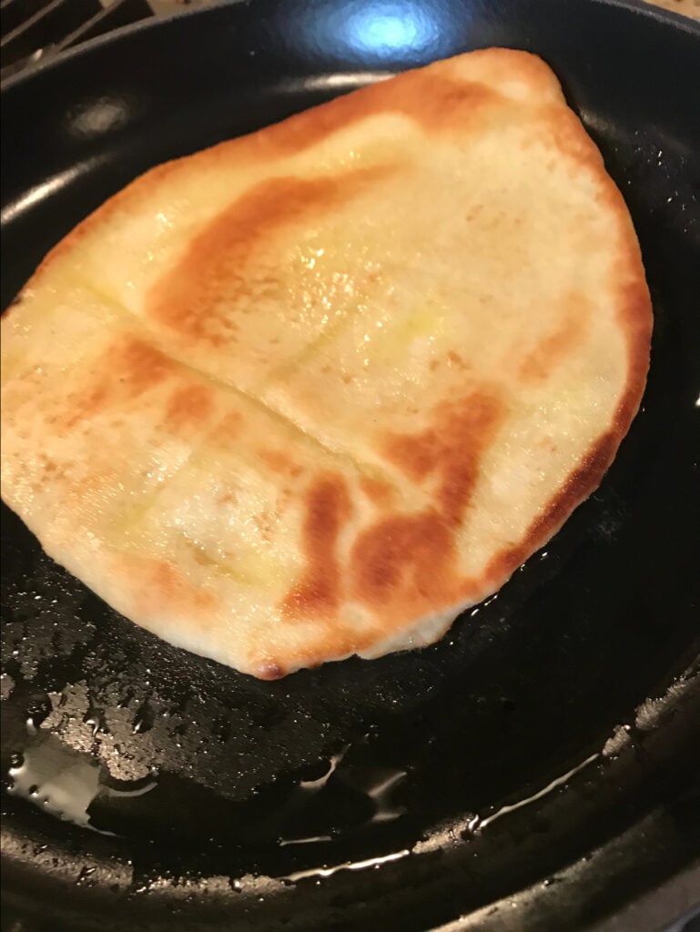 - Heat a skillet with a couple of tablespoons of olive oil. I use a cast iron skillet to toast my naan, but this is not a requirement.