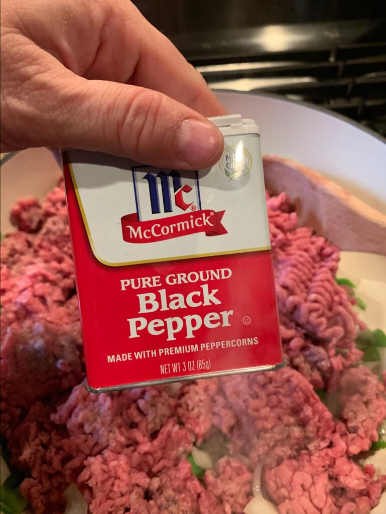 - Next, add all you spices, salt, pepper, and Worcestershire sauce and cook the meat in it for a little bit.
