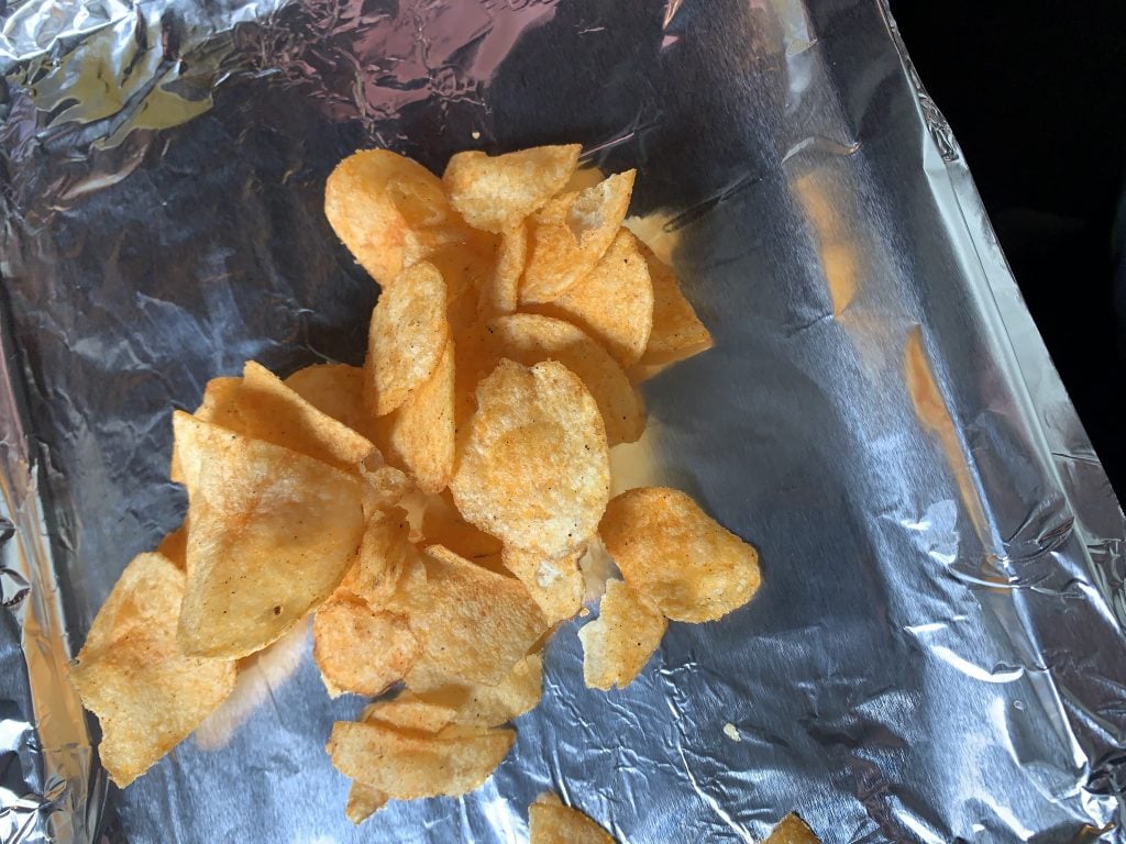 - Spread your potato chips on the tray. I didn't spread mine out they were kind of overlapping each other. I used my toaster oven baking sheet and used about three handfuls of chips.