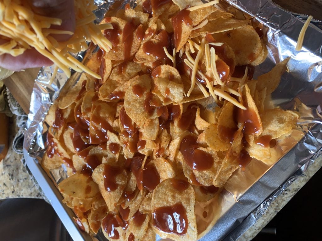 - Take your BBQ sauce and drizzle some of it over all the chips.