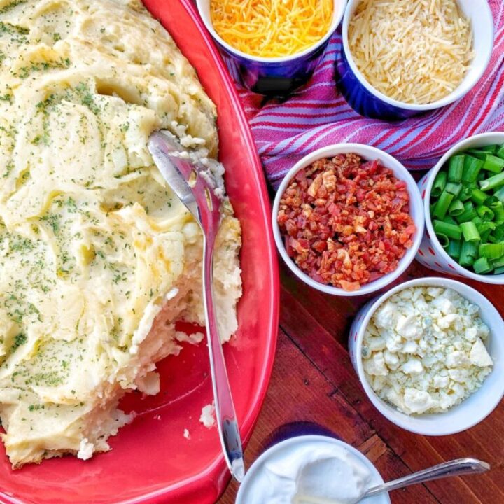Loaded Mashed Potato Casserole is a hostess's dream. Make ahead and bake later then build a board with all your favorite toppings and let guests serve themselves for a great game day snack.