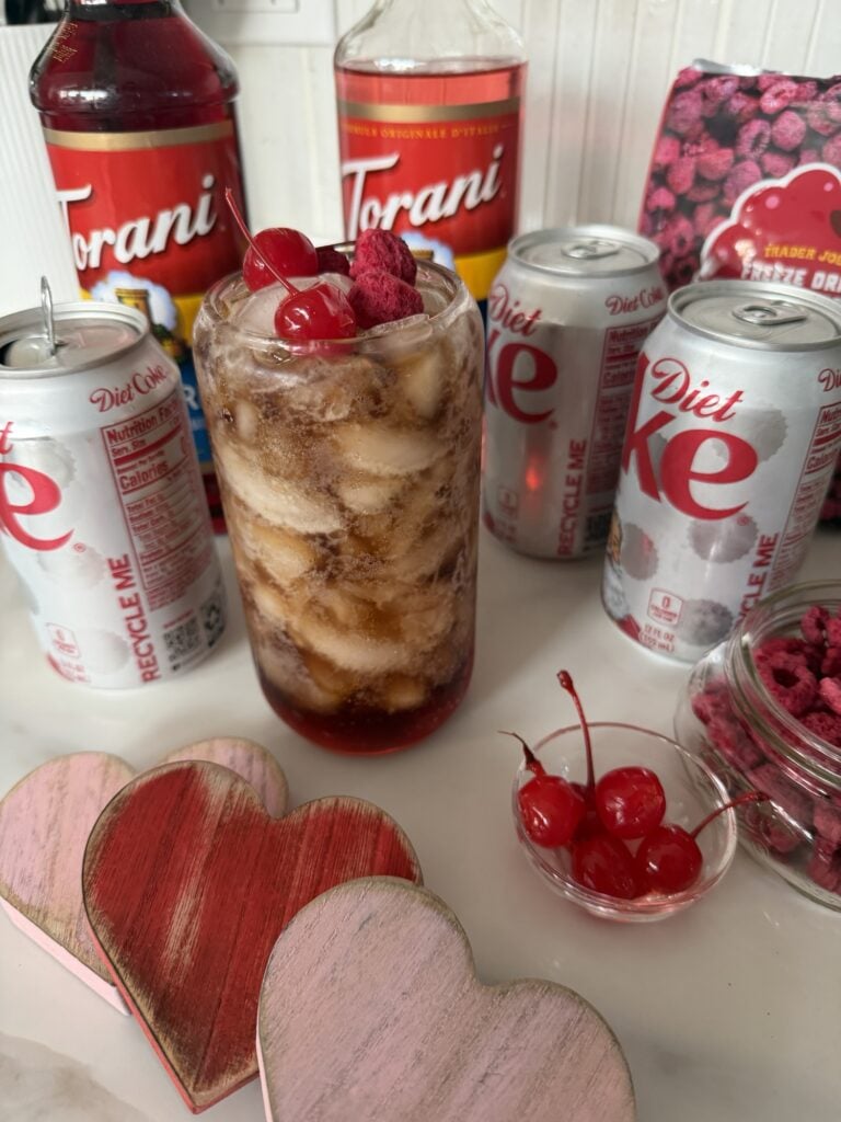 This Raspberry Rose Diet Coke is light, crisp, floral, and just sweet enough to feel special without being over the top. It also makes the cutest little Valentine’s Day gift basket for a Diet Coke lover with the syrups, fun straws, and a few garnishes tucked inside.