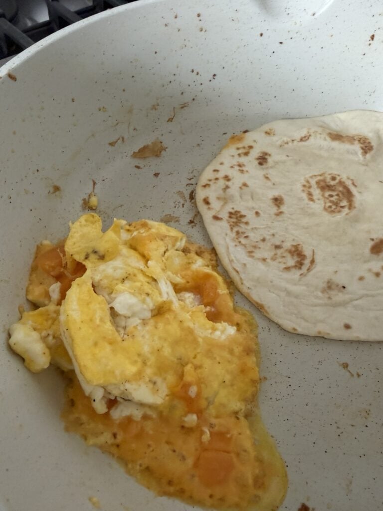 - Add the butter to the same skillet and allow it to melt. Do not wipe out the pan. Add the eggs and scramble them to your desired doneness, cooking them firm for a hearty breakfast taco texture.