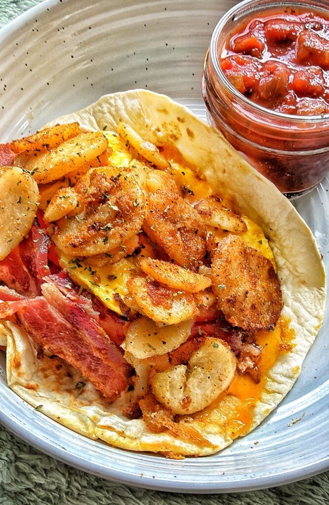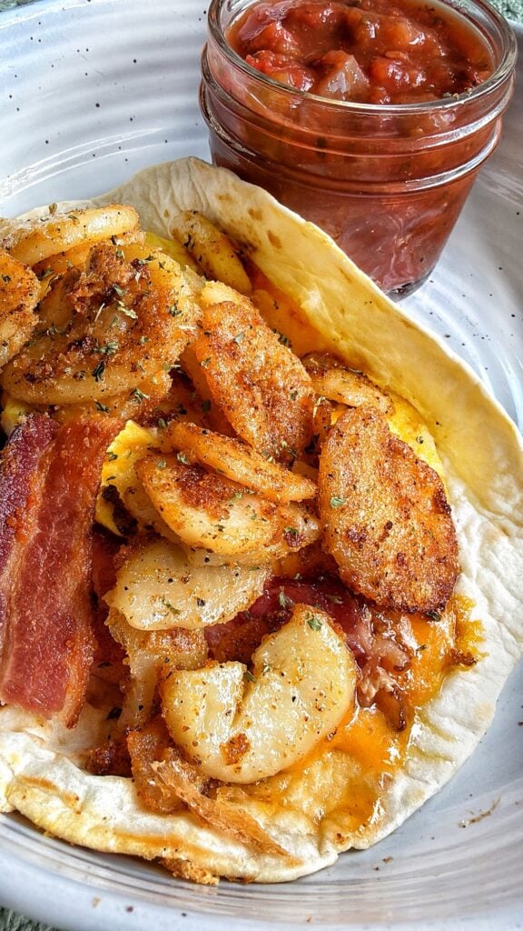 - To assemble, add a generous scoop of scrambled eggs to each tortilla. Top with crispy bacon and 1 to 2 heaping tablespoons of the seasoned fried potatoes. Garnish with dried parsley if desired and serve with salsa on the side.