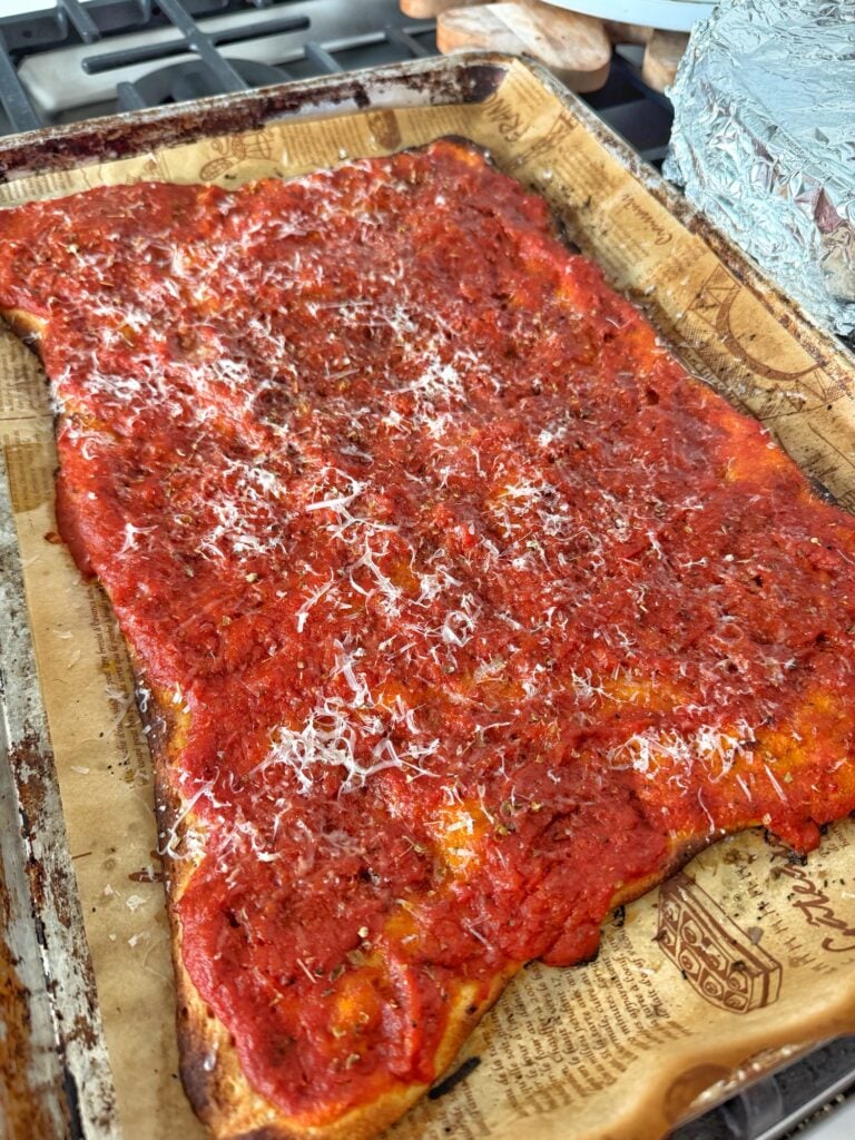 Now let me just say, I am in no way claiming this is an authentic New Haven-style pizza. Those are made in coal-fired ovens with techniques that have been perfected for generations. This is my Tipsy shortcut, home kitchen version using what I have on hand. This is just my personal take on a tomato pie that gives you that same crispy, saucy, lightly cheesy vibe without needing a specialty oven or a trip to Connecticut. Although I want to take a pizza tour of Connecticut.