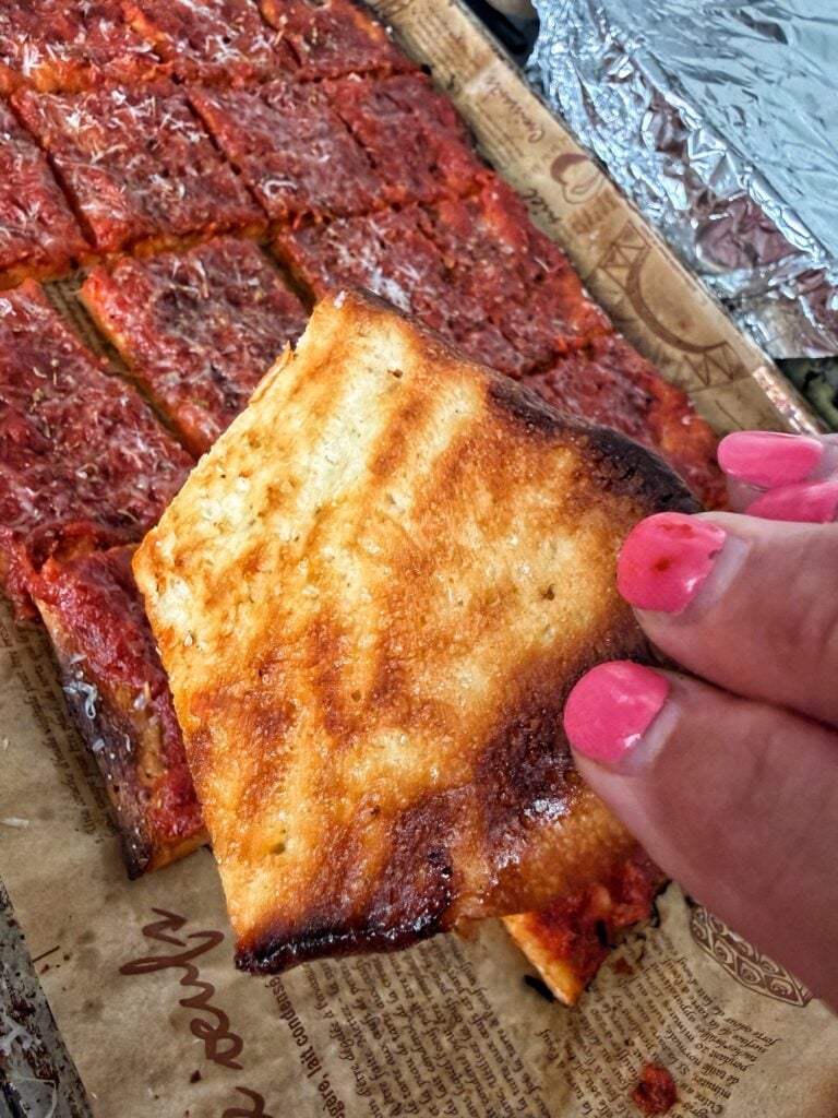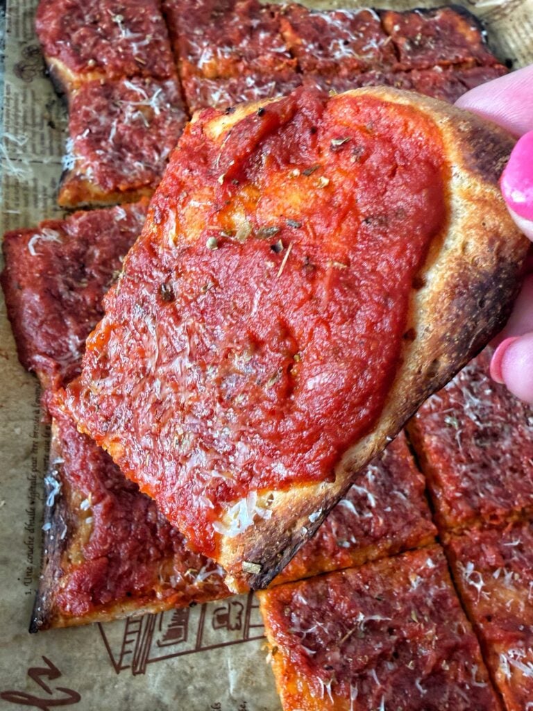 I’ve also always loved those gooey middle pieces of a Chicago tavern-style pizza, where the top is a little soft and saucy but the bottom still has that crunch. It’s kind of the best of both worlds, and that’s really what inspired me to start making this at home. I didn’t even have a name for it back then, I just called it tomato pie and kept making it over and over.