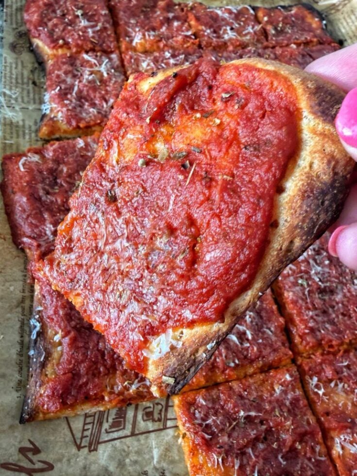That style of pizza, called “apizza” (pronounced ah-beetz), comes from New Haven, Connecticut and dates back to Italian immigrants in the early 1900s. It’s traditionally cooked in coal-fired ovens and is known for its thin, crisp crust, charred edges, and very light use of cheese. Sometimes just a sprinkle of Parmesan or none at all. One of the most famous versions is the tomato pie, which is exactly what this is inspired by. It is simple ingredients, bold flavor, and letting the sauce and crust do all the work.