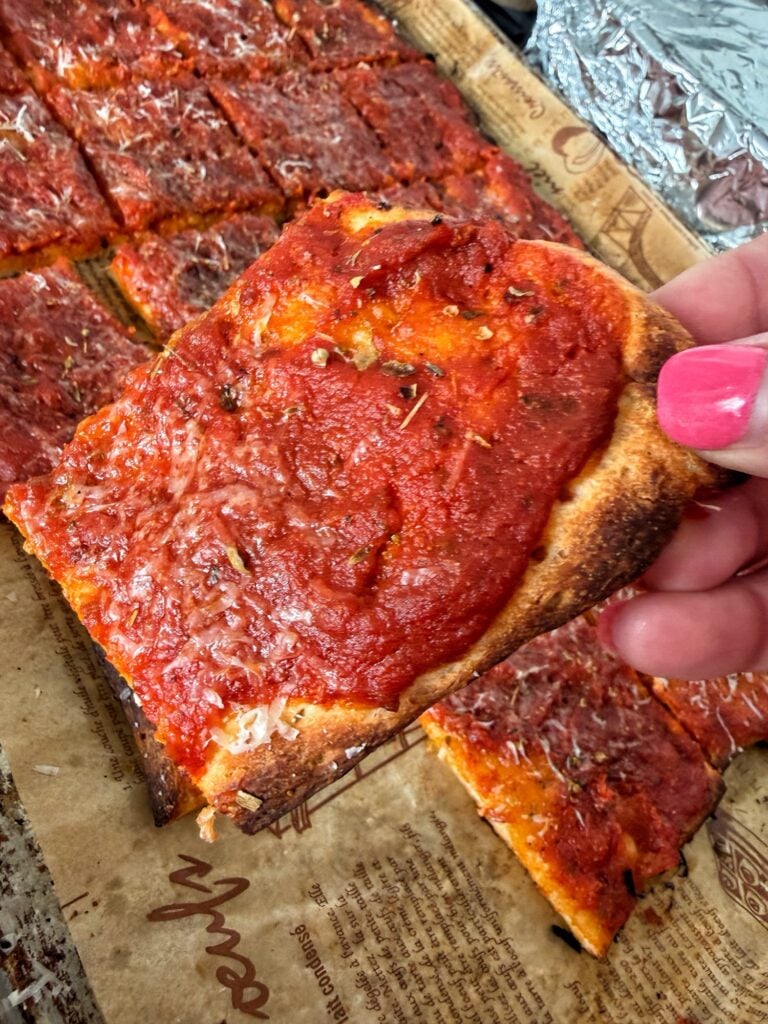 It also didn’t hurt that it was a little cheaper to make since you don’t need a ton of cheese or fancy ingredients. For years I used my favorite marinara from Aldi, which always worked great. Recently I made my own pizzeria-style sweet oregano tomato sauce and knew I had to try it with this.