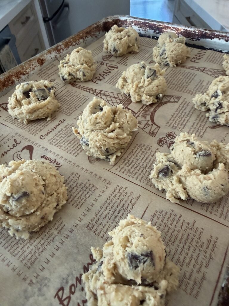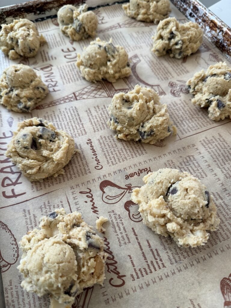 One of the biggest mistakes I used to make when baking was not letting my butter and eggs come to room temperature first. This really does make a difference. Softened butter creams properly with the sugar, creating a light, smooth base that helps give the cookies structure and that perfect texture. If the butter is too cold, it won’t mix evenly. If it’s too melted, the cookies can spread too much. Room temperature eggs also blend more easily into the dough, which helps everything come together evenly and results in a better, more consistent bake.