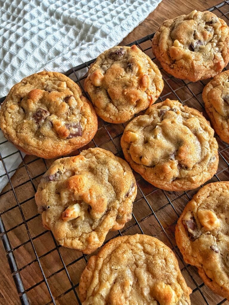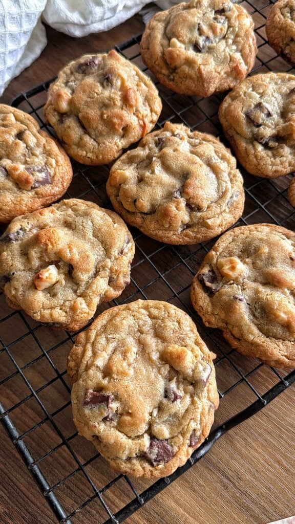 These thick, royal coconut macadamia chocolate chunk cookies are loaded with toasted coconut, buttery macadamia nuts, and melty chocolate chunks. This makes for the perfect balance of crisp edges and soft, chewy centers. Chilling the dough and pulling them just slightly under baked gives you that rich, indulgent texture just like the famous Nordstrom cookies.