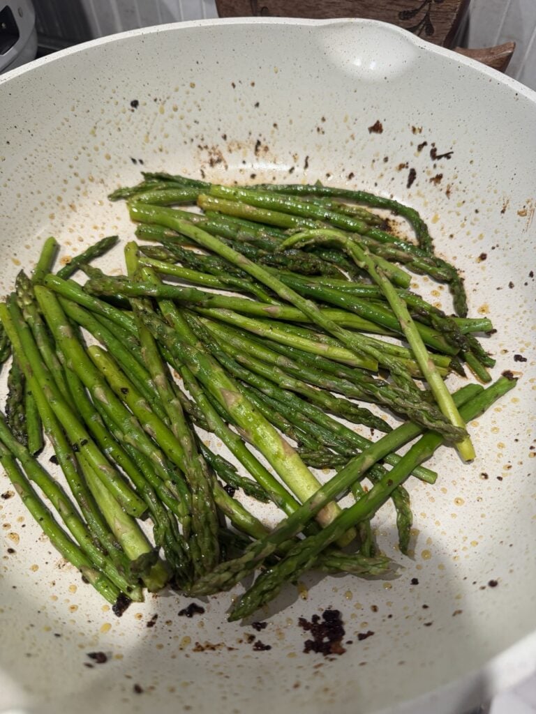 - In the same pan, add the asparagus and cook for a few minutes until slightly tender but still crisp. Remove from the pan and set aside.