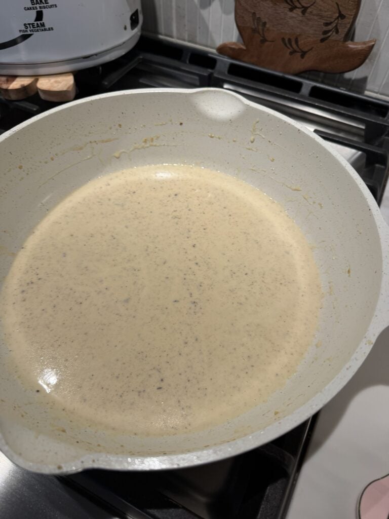 You’re aiming for a texture similar to a can of cream soup after adding water. You want this to be not too thick and not too thin. It needs to be just loose enough to melt the cheese smoothly. I actually prefer to keep it a little thinner since it gets poured over the baked croissants. If you follow the steps, it comes together very easily.