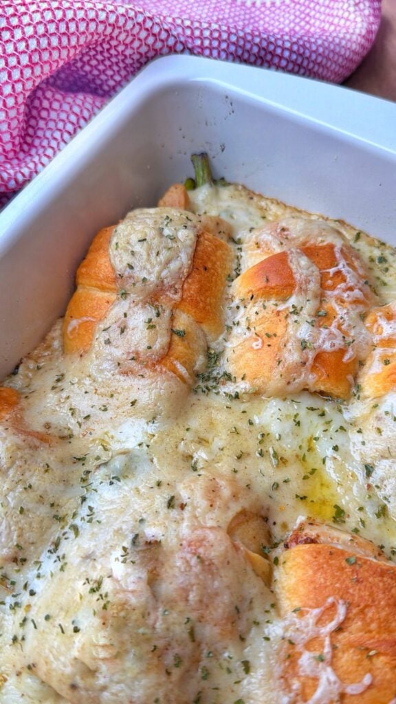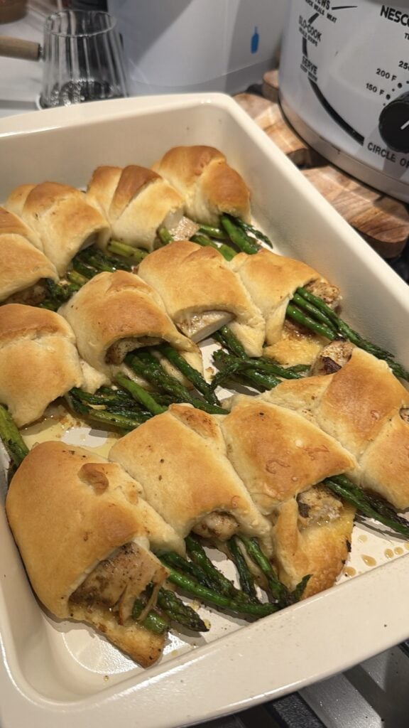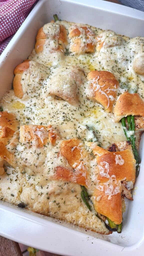 Buttery crescent rolls are stuffed with seasoned chicken, tender-crisp asparagus, and Swiss cheese, then baked until golden. Finished with a creamy, bubbly cheese sauce, this cozy casserole is easy enough for a weeknight but feels like something special.