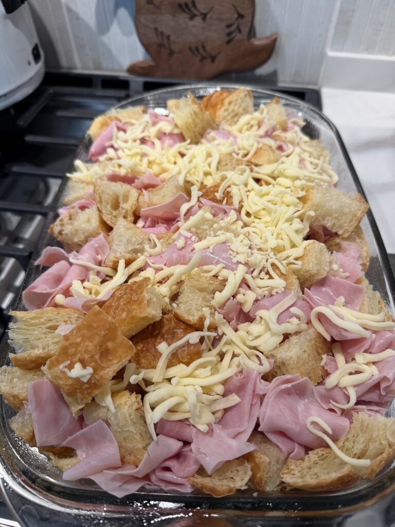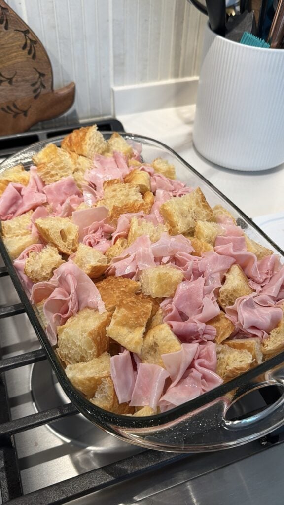 - Add the croissant pieces to the baking dish, spreading them out evenly. Sprinkle the diced ham and cheese over the croissants, making sure everything is well distributed. I use shaved Krakus ham and sort of slightly roll it up so that it doesn't dry out when it bakes.