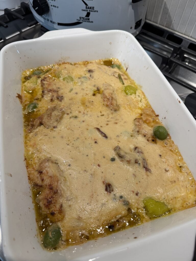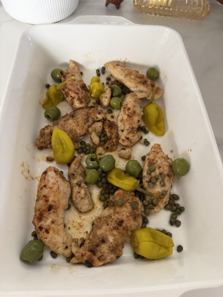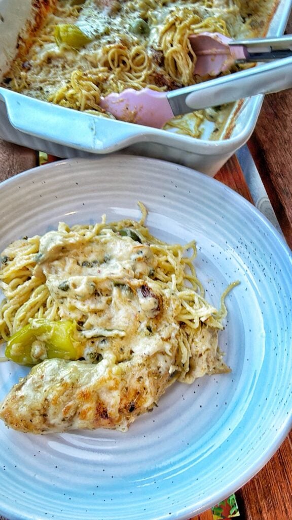 Juicy, seasoned chicken is baked in a creamy sun-dried tomato cheese sauce with a tangy kick from pepperoncini and red pepper relish. It’s a rich, flavor-packed dish that’s perfect served over pasta or with crusty bread to soak up every bit of that sauce.