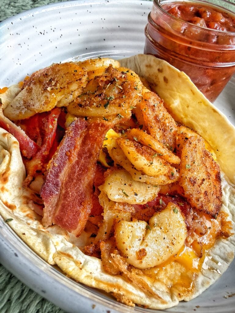 Canned Potatoes In A Tortilla These Mexican Inspired Breakfast Tacos are packed with bacon fat fried crispy potatoes. They are seasoned with cumin, chili powder, garlic salt, and black pepper. Then layered with fluffy scrambled eggs and pockets of sharp cheddar cheese. Wrapped in warm flour tortillas and topped with crispy bacon. These are bold, hearty, and perfect for a weekend brunch or a crowd pleasing breakfast spread. I was thinking about a simple Lenten supper when I remembered the most delicious breakfast tacos I once had at a little breakfast spot in Florida. They were loaded with crispy fried…