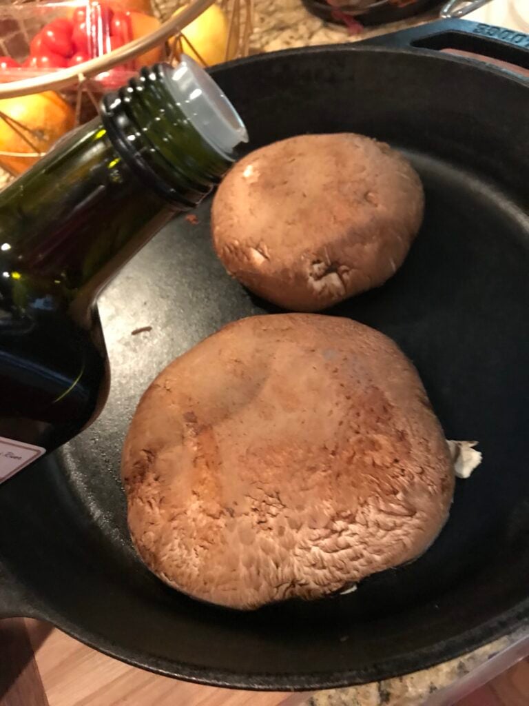 Add the mushrooms to a hot skillet and sprinkle each side with olive oil. Then place the mushrooms in the oven at 375 degrees for about 25 minutes, or until mostly soft to the touch.