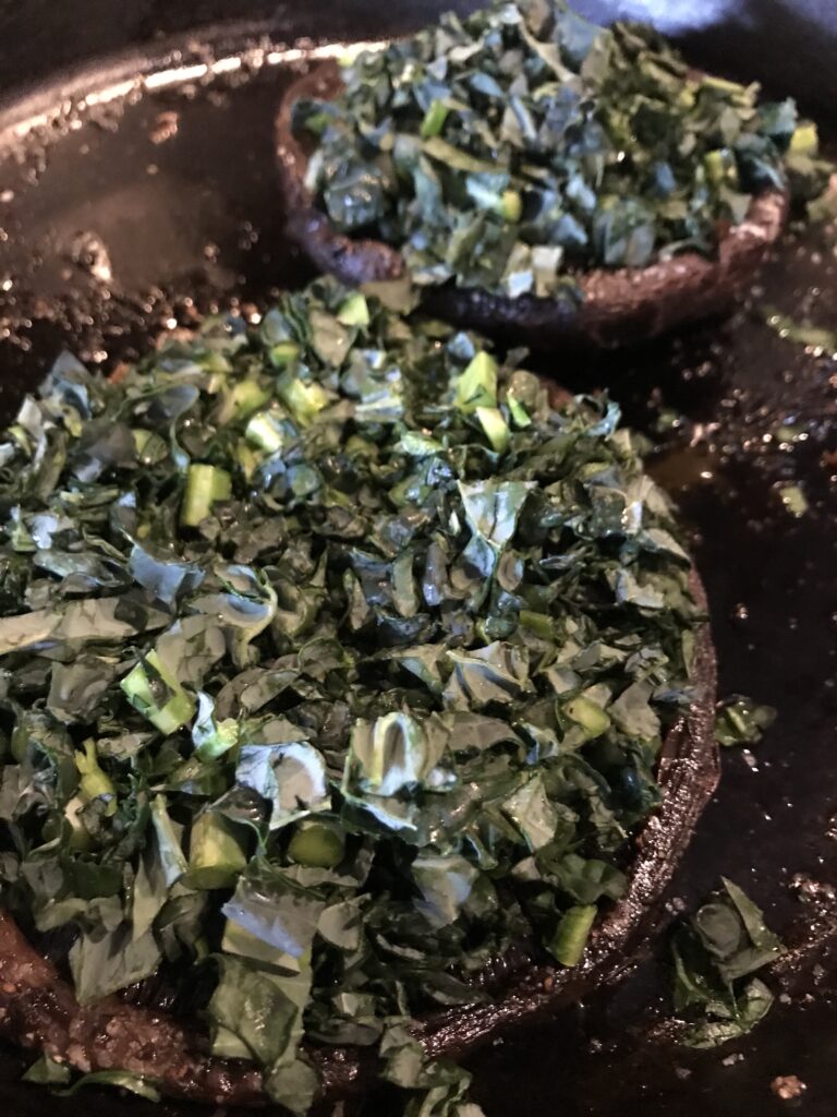 Take the mushrooms out and use a spoon to press down the inside of the mushrooms. Add the minced kale to the inside of the mushroom. Mound the kale pretty high. It will wilt while baking. Make a little divot in the kale. Next sprinkle a little olive oil on the Kale and season it with salt and pepper.