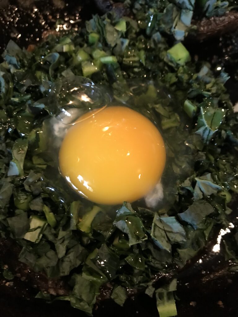 Carefully add an egg to the divots you made in the kale. Then place your skillet into the oven and bake for about 15 minutes. Or until the eggs is cooked to the consistency you choose.