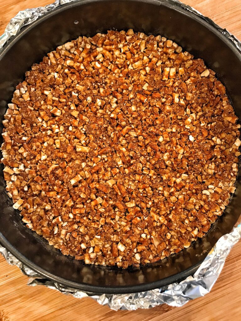 - Bake the pretzel crust at 325 degrees for 8 minutes, let cool.
