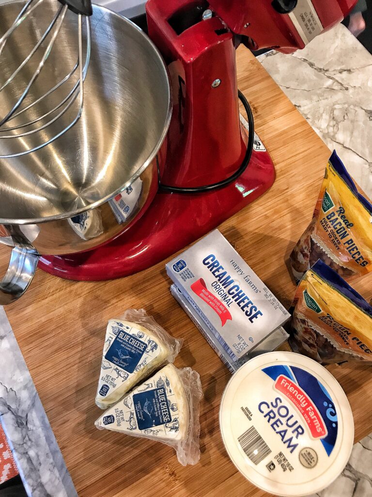 - In a stand mixer, mix the cream cheese, bleu cheese, sour cream in a mixer until well combined.