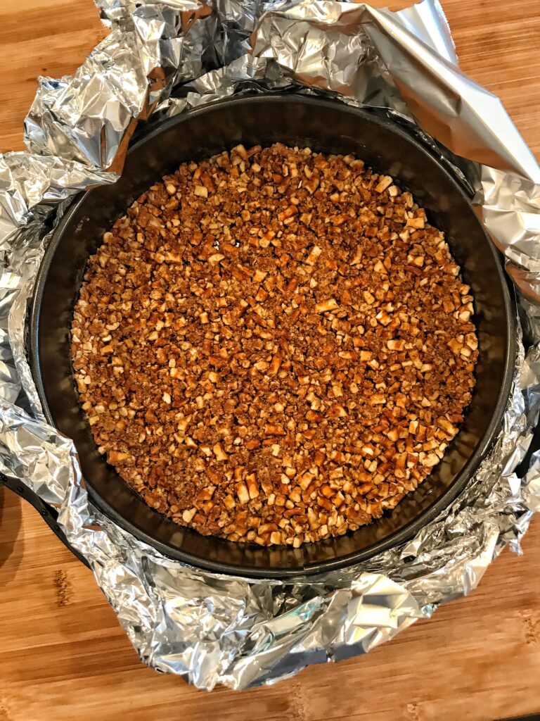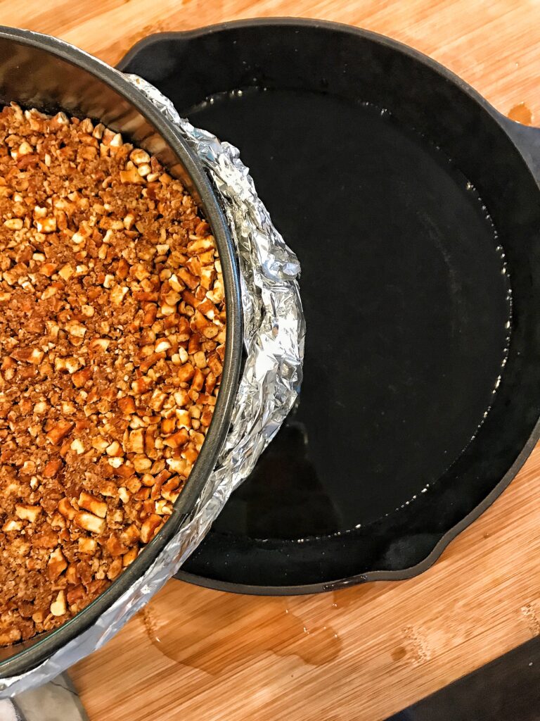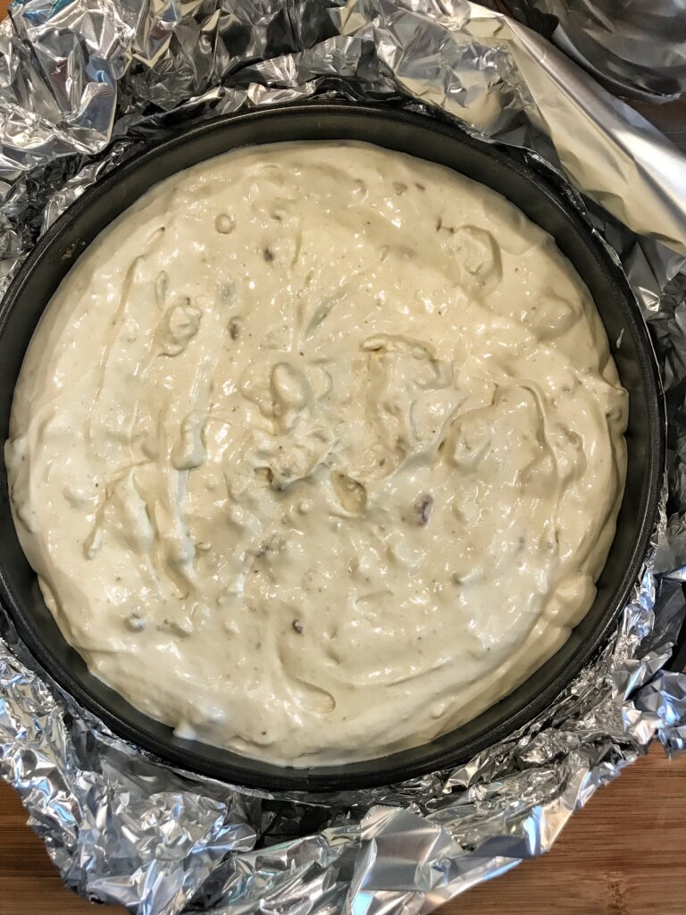 - Wrap the outside of your spring form pan in a few layers of foil, allowing the foil to come up the sides of the pan. Make sure you have a few different layers so no water can seep in.