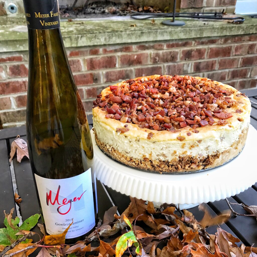 This recipe makes for a decadent treat for a large group as each person only needs to enjoy a small slice. You can really wow your guests with this recipe and it is perfect for the upcoming holidays. We really enjoyed this recipe while sipping on the delicious wine and enjoying the Fall weather. The sweetness of the wine paired with the saltiness of the cheesecake was the perfect combination!