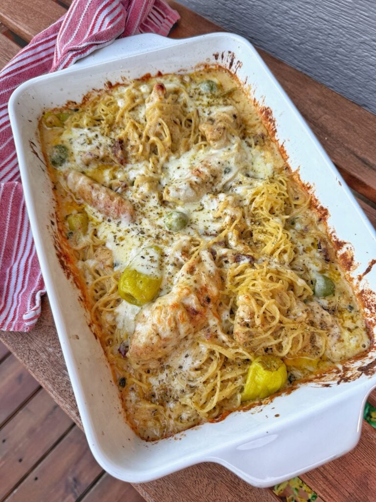 Make Ahead & Bake When Ready Creamy Sun-Dried Tomato Chicken & Spaghetti Bake features tender, seasoned chicken and pasta coated in a rich, cheesy sauce with pops of tangy sun-dried tomatoes and pepperoncini. Baked until hot and bubbly, it’s a cozy, flavor-packed dish that’s perfect for an easy, satisfying dinner. This Chicken Bake came together after I made the cheese sauce for my charcuterie nachos and realized it would be just as good poured over baked chicken and spaghetti. It’s one of those easy, throw-it-together ideas that turns into something really special. All those bold, tangy flavors baked into a…