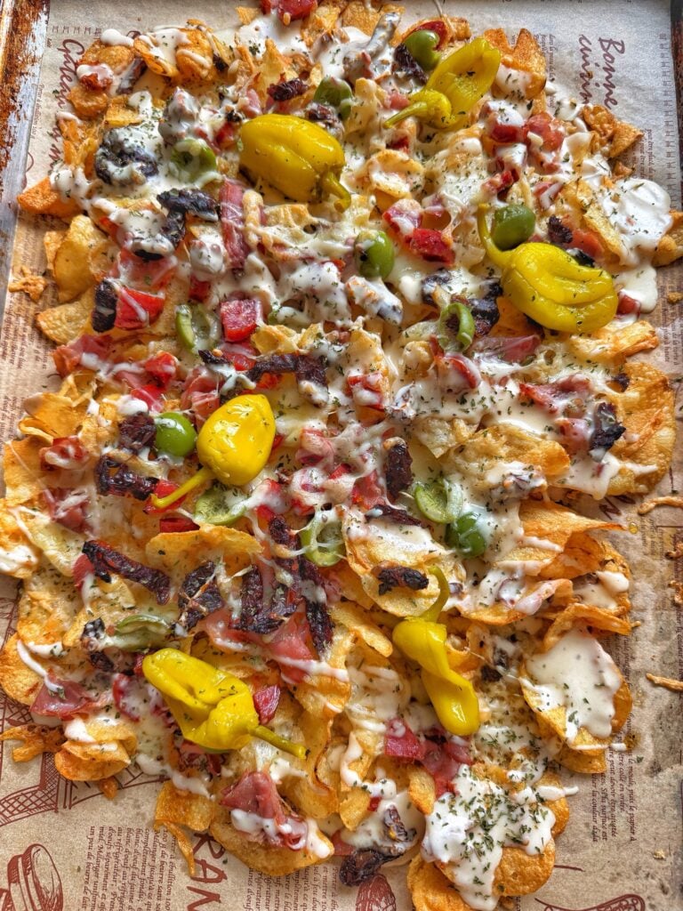 The Best Of Both Worlds These Charcuterie-Style Baked Nachos with Creamy Sun Dried Tomato Cheese Sauce are piled high kettle chips topped with sharp white cheddar, prosciutto, salami, olives, and sun-dried tomatoes. It’s finished with creamy mozzarella cheese sauce flavored with red pepper relish, Worcestershire, and garlic to bring all your favorite board flavors into one irresistible pan for a bold, savory bite. Apparently these charcuterie nachos are having a full viral moment right now, which is funny because I somehow missed it completely… I’m usually knee-deep in every food trend on the internet. It is my expertise in fat…
